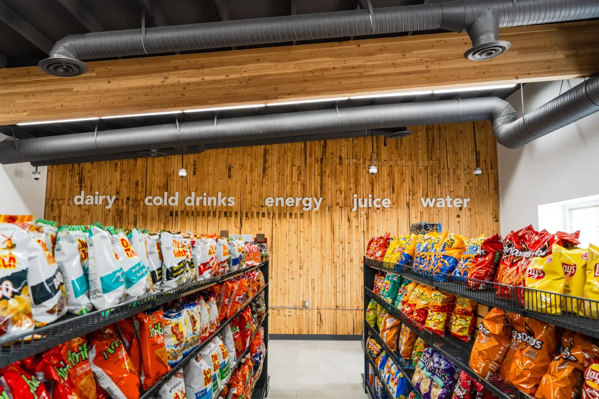 Much more than a place to refuel your gas tank, our Mass Timber structure is designed as a gathering space for generations to come. Honoring the site’s history as a hub for community, we look to the future with a sustainable, modern building that carries forward that same spirit—built to last and foster all types of conversations. Some about the community and also the reclaimed wood building itself!